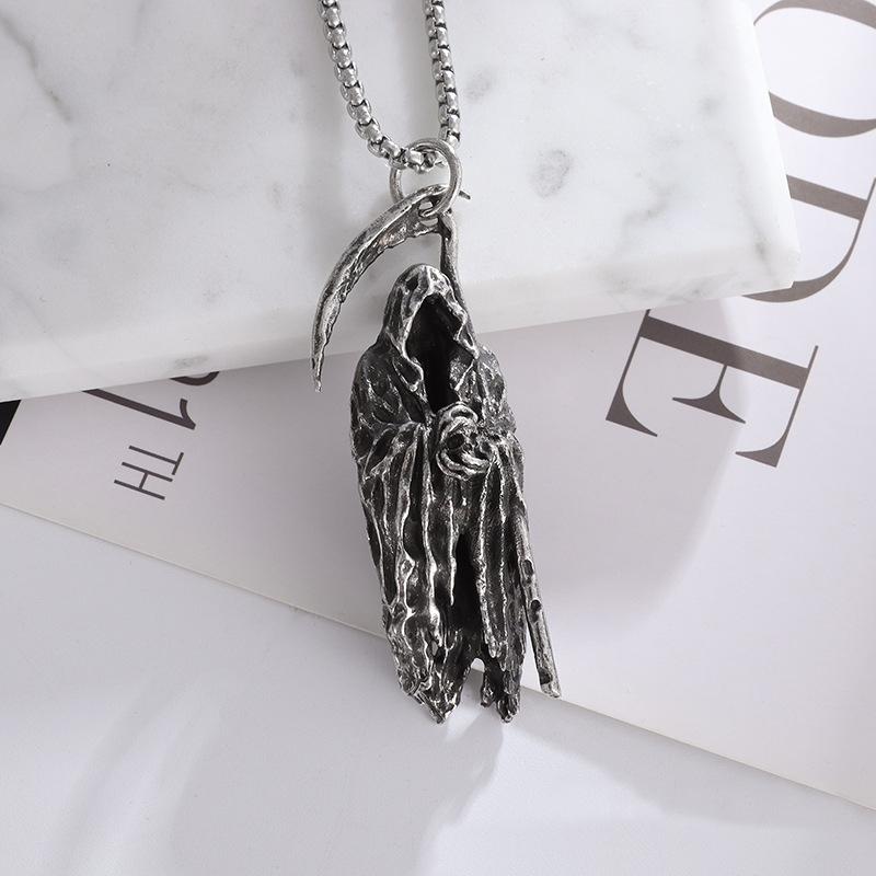 Retro Cloaked Grim Reaper with Sickle Pendant Necklace For Men Hip Hop Punk Copper Color Stainless Steel Neck Chain Jewelry Gift