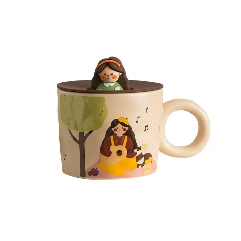 Retro Cartoon Girl with Lid Mug Couple Water Cup Office Household High Value Ceramic Breakfast Cup Drinking Cup