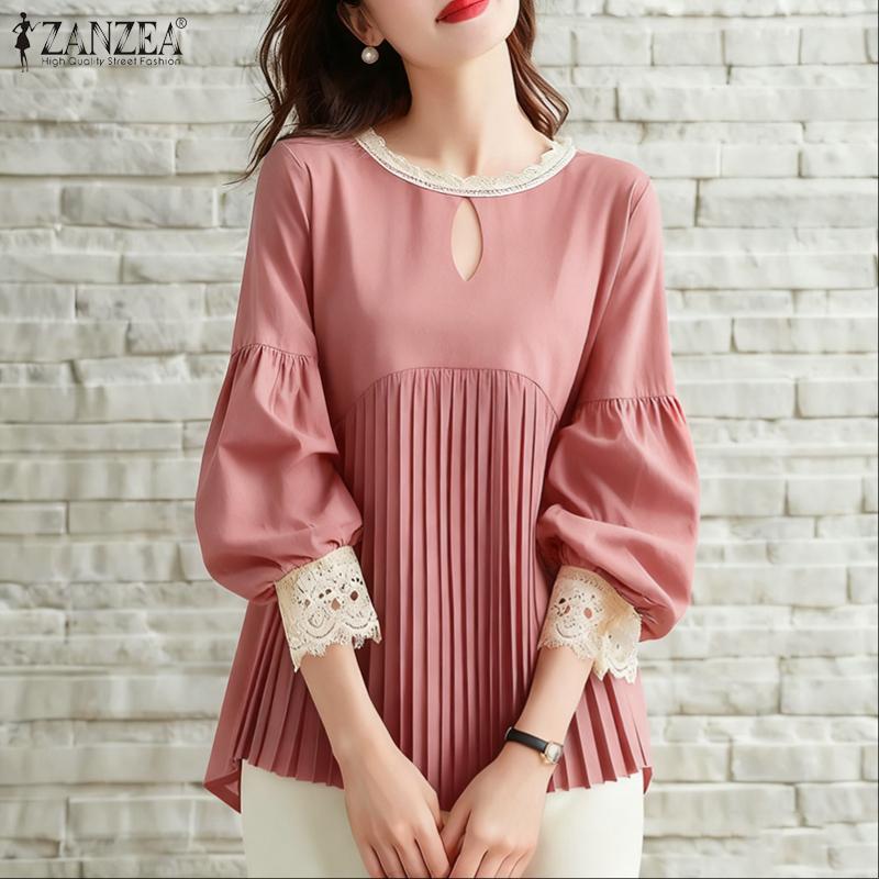ZANZEA Women Casual Round Neck Lace Splice 3/4 Sleeve Blouse