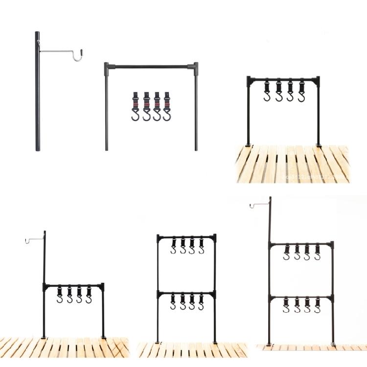 CONVENIENT TO STORE. This camping lamp stand cookware hanging rack is removable designed, which takes up less space and is easy to carry, Collapsible design for easy to store.