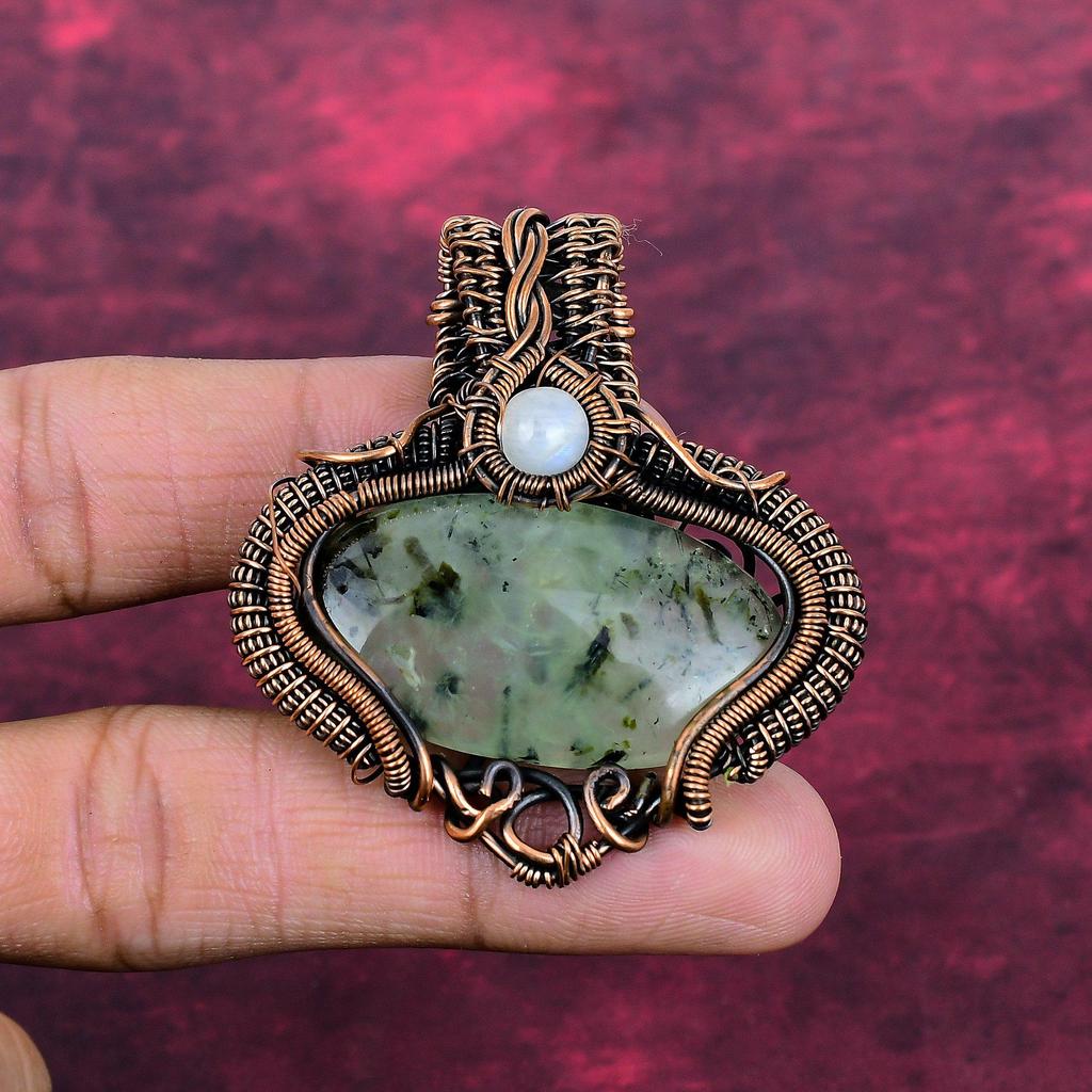 Moss Prehnite Pendant Copper Wire Wrapped Pendant Rainbow Moonstone Gemstone Jewelry