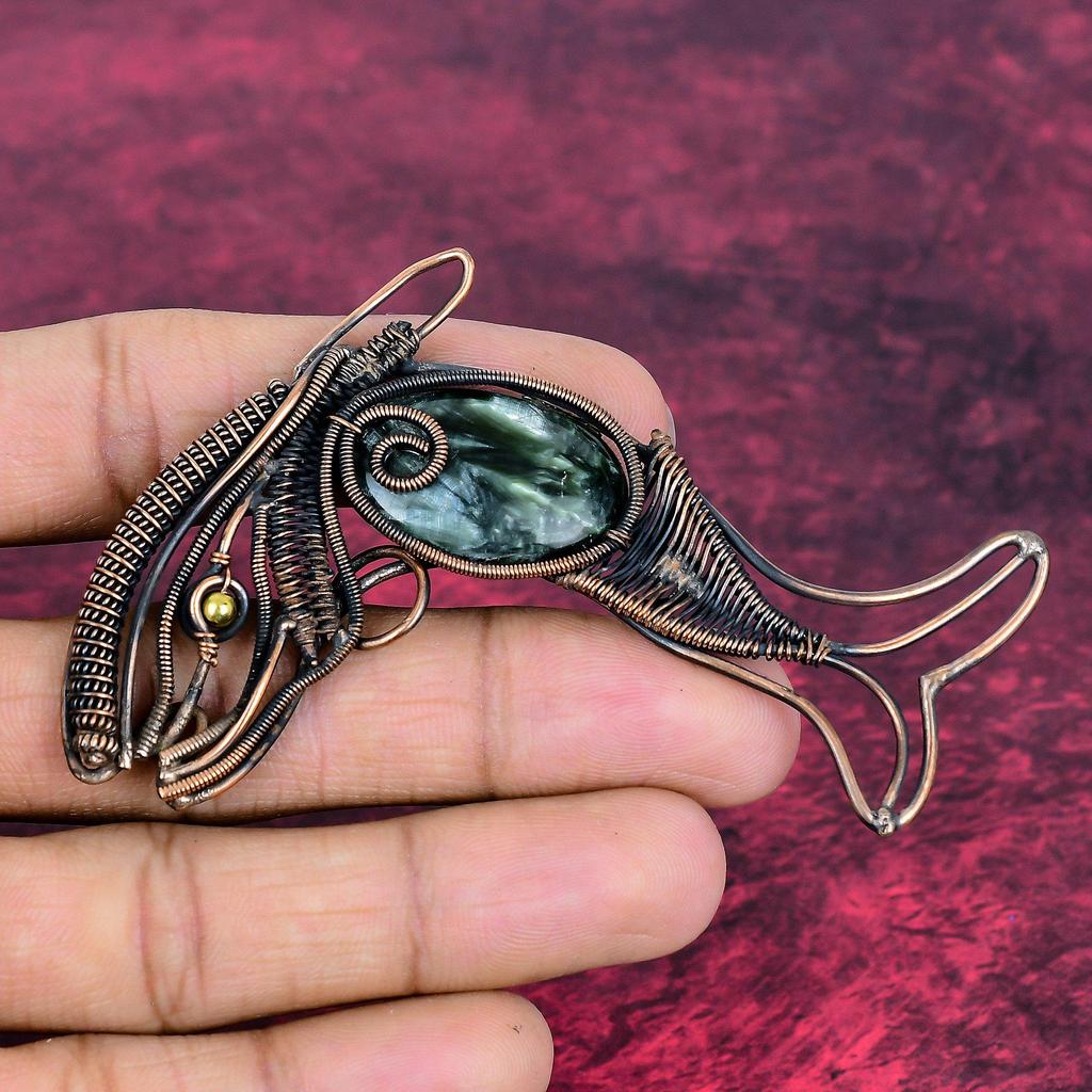 Seraphinite Gemstone Pendant Copper Wire Wrapped Pendant Fish Handmade Jewelry