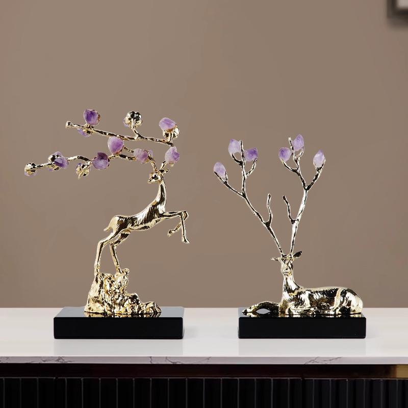 Metal Handicrafts Crystal Deer Figurine Simulation Animal Sculpture Natural Crystal Metal Figurine Home Decoration Accessories