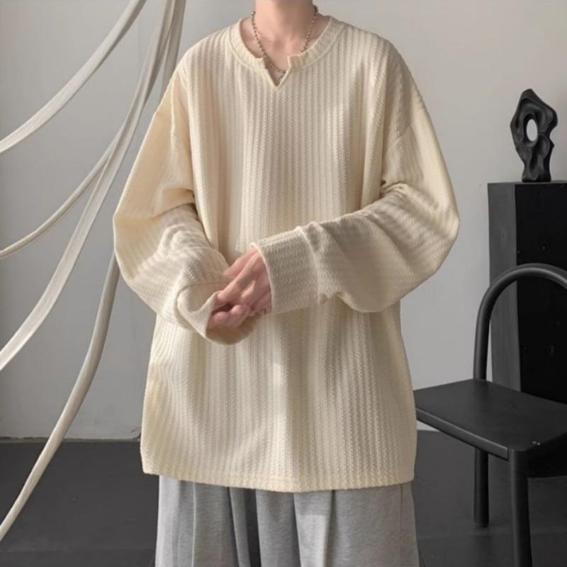 Spring Autumn V-neck Solid Color Casual Fashion Pullover Tee Male Long Sleeve All-match Bottomed T-shirt Top Men
