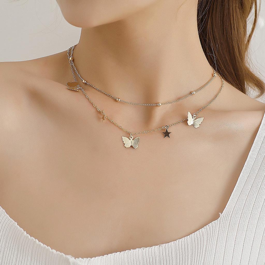 Fashion Personalized Bead Chain Accessories, Double-layer Simple Metal Star Butterfly Pendant Necklace