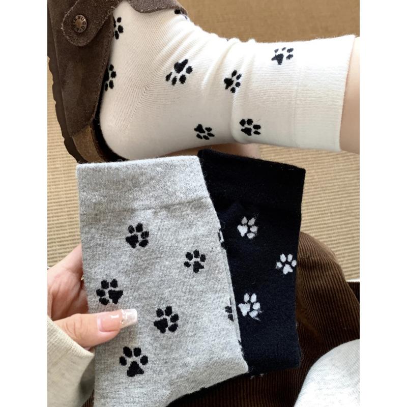 Korean Style Cute Puppy Paw Print Socks Medium Tube Socks Black And White Gray Niche Design Pure Cotton Stacking Socks