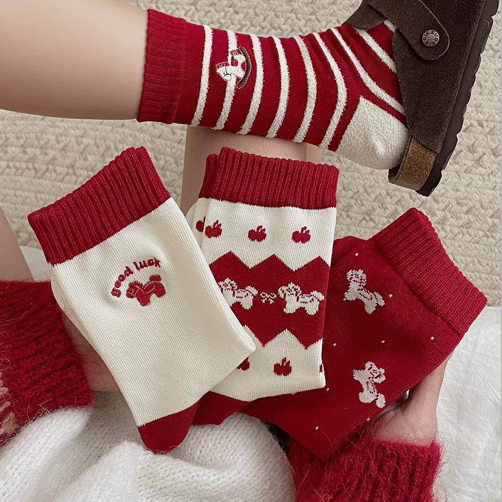 Year Of The Horse Red Socks Mid-Leg Socks Season Thickened Warm Embroidered Pony 26 New Year'S Stockings