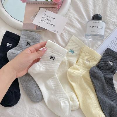Embroidered Bow Socks Stacking Socks Season Pure Cotton Boneless Double Needle Cute Cotton Medium Tube Socks Women