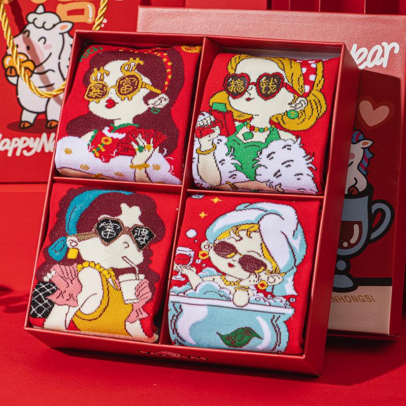 Get Rich And Make Money Gift Box Red Socks Pure Cotton Medium Tube Socks Season Big Red Festive New Year Socks