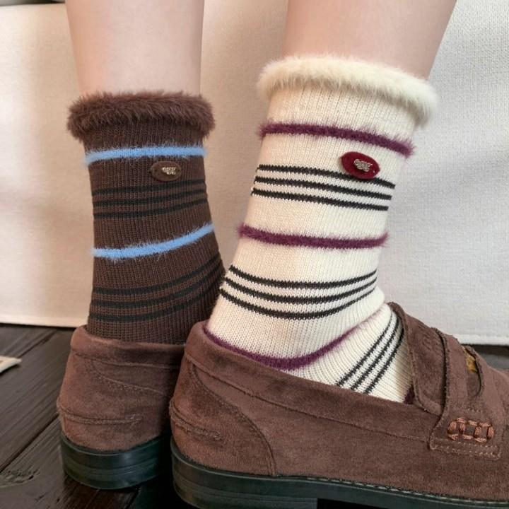 Mink Fleece Splicing Striped Plush Egg Buttons Trendy Socks Thickened And Warm College Style Pile Socks Cotton