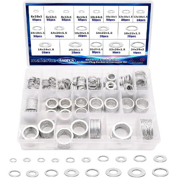 Packing Includes: maierke cush washer oil drain plug kit is totaling 580 PCS, with 18 sizes, including: M6(110 PCS),M8(110 PCS),M10(100 PCS),M12(70 PCS),M14(60 P CS),M16(40PCS),M18(40 PCS),M20(20 PCS),M22(20 PCS),M24(10 PCS)