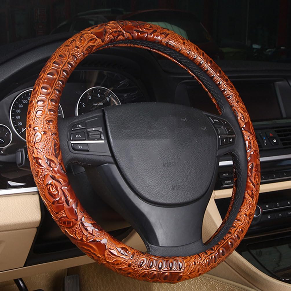 Leather Auto Car Steering Wheel Cover,Anti Slip Universal 15 Inch,Brown Crocodile With Rose Grain