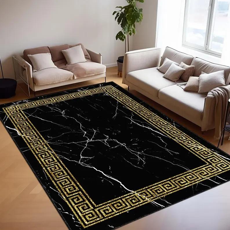 Black Marble Design Area Rug with Gold Accents Modern Carpet for Living Room Elegant Floor Mat Stylish Home Rug Gold Framed Rug