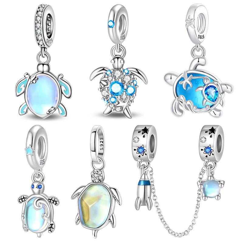 Blue Zircon Inlay Sea Turtle Starfish Charms Bead Original 925 Sterling Silver Pendants Fit Bracelet Jewelry Gift Marking