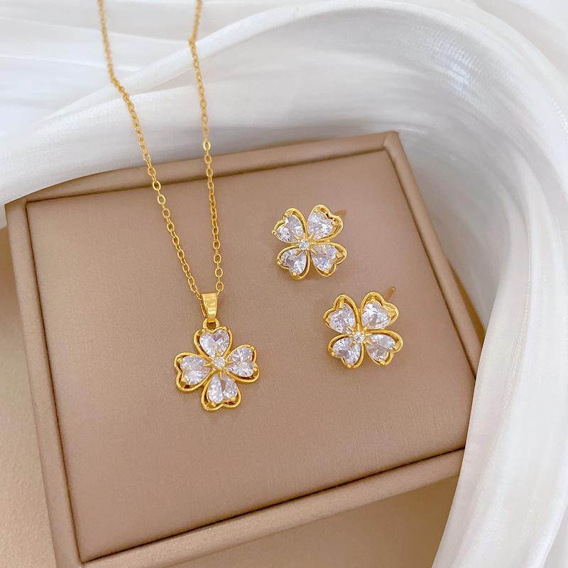 Necklace Earrings Set Light Luxury Full Diamond Four-Leaf Flower Love Personality Temperament Banquet Earrings Item Group