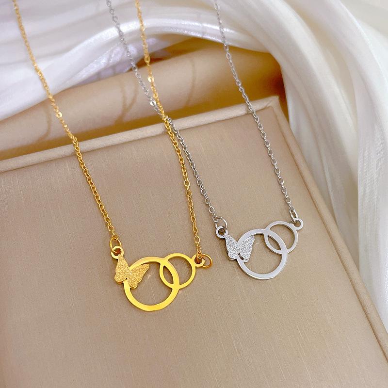 Titanium Steel Double Ring Butterfly Temperament Personality Minimalist Furnace Real Gold Necklace Female Collarbone Chain