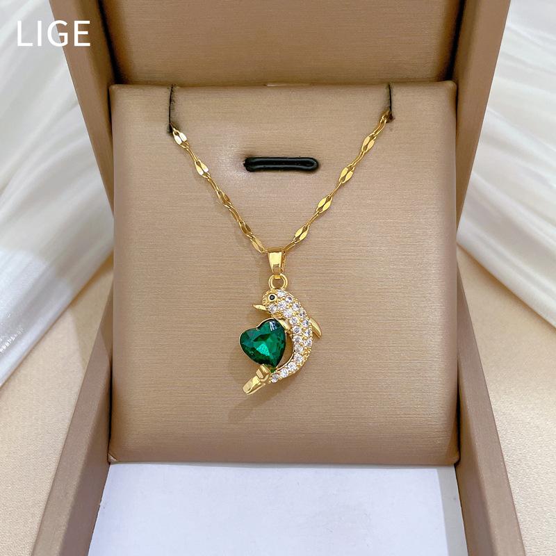 Green Love Dolphin Light Luxury Temperament Gorgeous Full Diamond Necklace Female Versatile Collarbone Chain Titanium Steel Chain