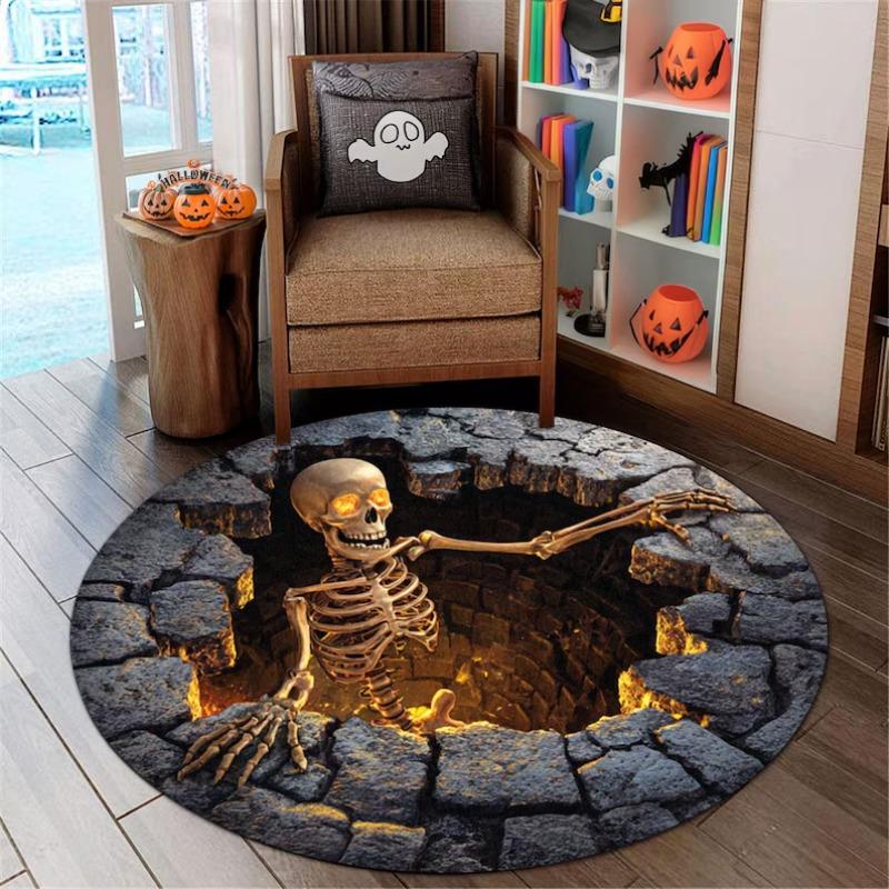 Dark Fantasy Circle Rug Glowing Skeleton Emerging From Cracked Stone Round Carpet Gothic Horror Decor Bedroom Game Room Floors