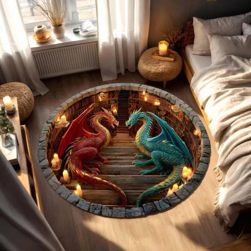 Dragon Book Round Rugs 3D Book Library Fantasy Rug Mythical Creature Home Decor Gift for Dragon Lovers Dragon Lover Book Decor