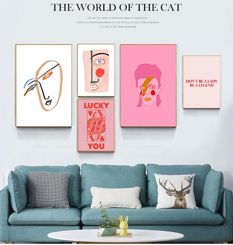 Nordic Abstract Poster Line Face Canvas Painting Wall Art Pink Style Letter Lucky You Pictures For Living Room Modern Decorative No Frame