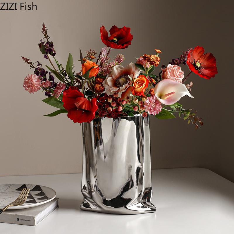 Silver Plated Ceramic Vase Desk Decoration Creative Pleated Vases Decorative Flowers Pots Flower Arrangement Modern Home Decor