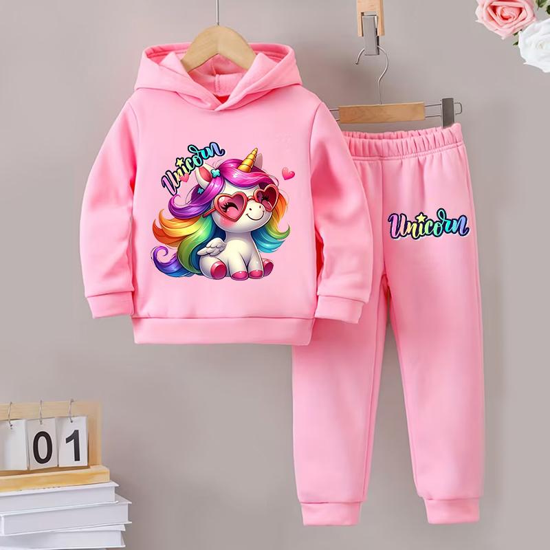 Girls Autumn/Winter 2Piece Set Cute Unicorn Print Hooded Sweatshirt Pants Warm Casual Stylish Active Play Perfect for Outdoor