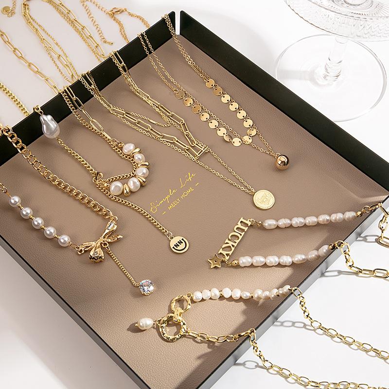 Light Luxury Temperament Collarbone Chain Gentle Pearl Splicing Necklace Multi-Layer Bow Letter Sweet Cool Girl Collar