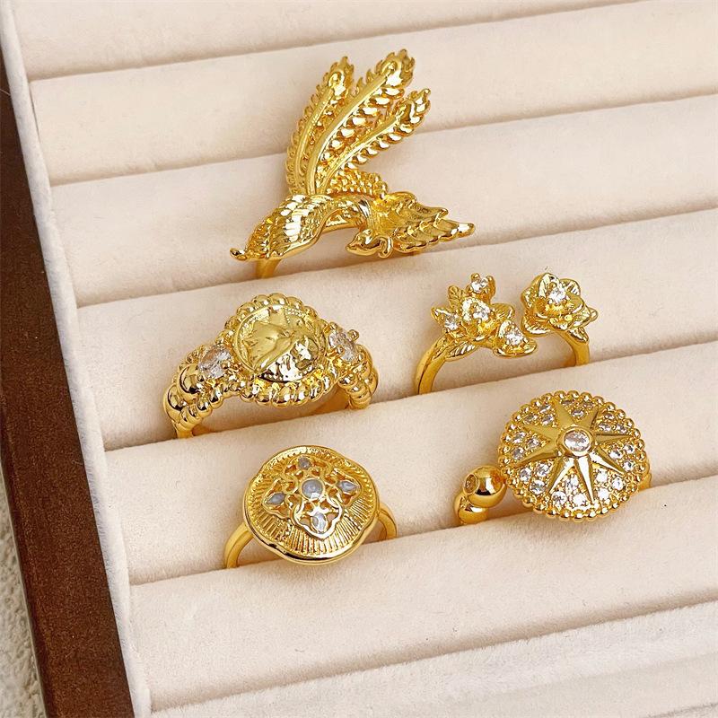 Medieval Style Flower Compass Open Ring Full Of Diamonds Zircon Court Style Retro Gold Phoenix Premium Ring