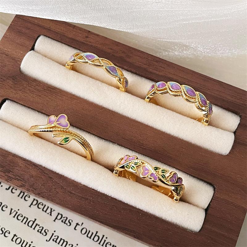 Enamel Flower Ancient Method Dripping Oil Gradual Change Opening Ring Women Exquisite Sweet Medieval Retro Light Luxury High Sense Ring