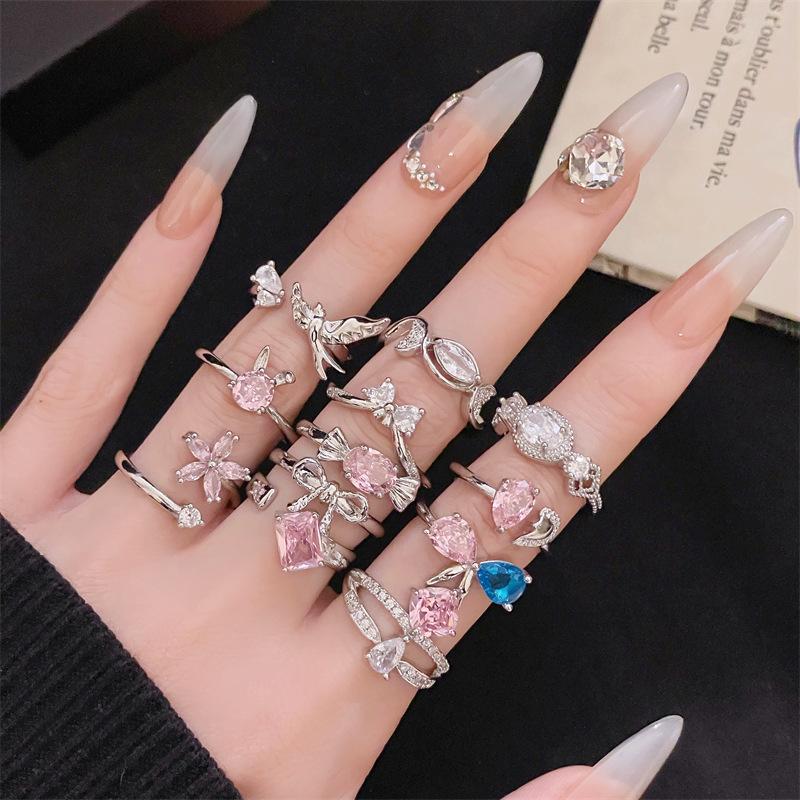 Color Diamond Open Ring Bow Flower Niche Design Elegant Light Luxury Cute Pink Zircon Personality Ring Woman
