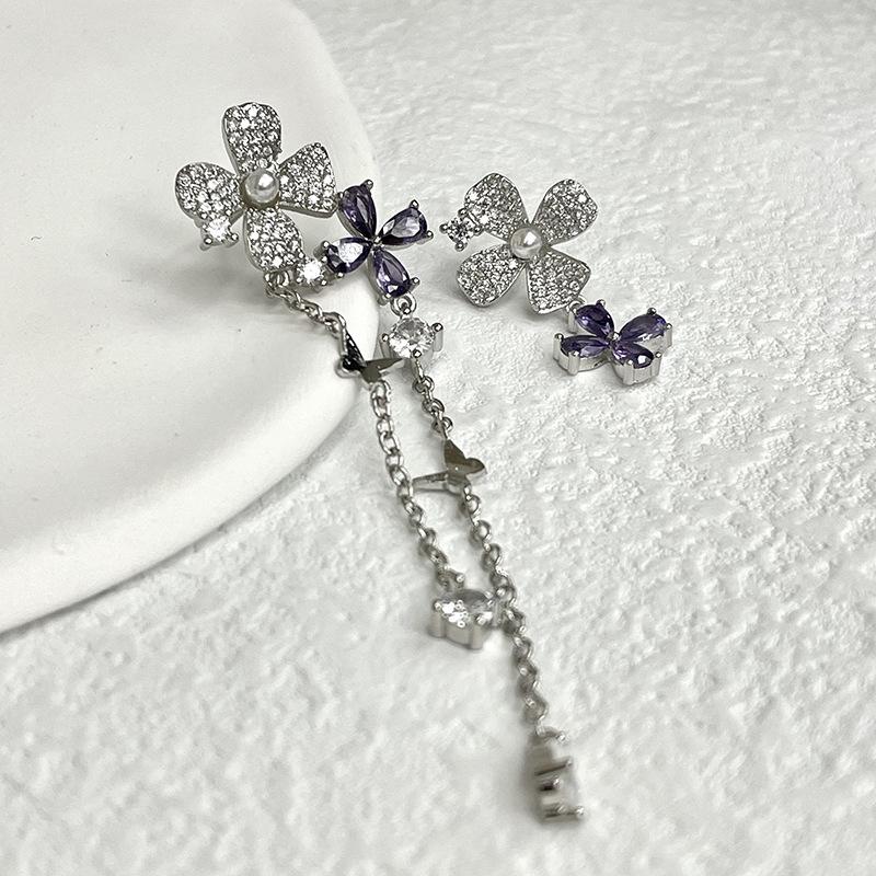 Flower Tassel Asymmetric Earrings Women'S Light Luxury Temperament Niche Design Micro-Inlaid Zircon High-End Stud Earrings Personalized Women