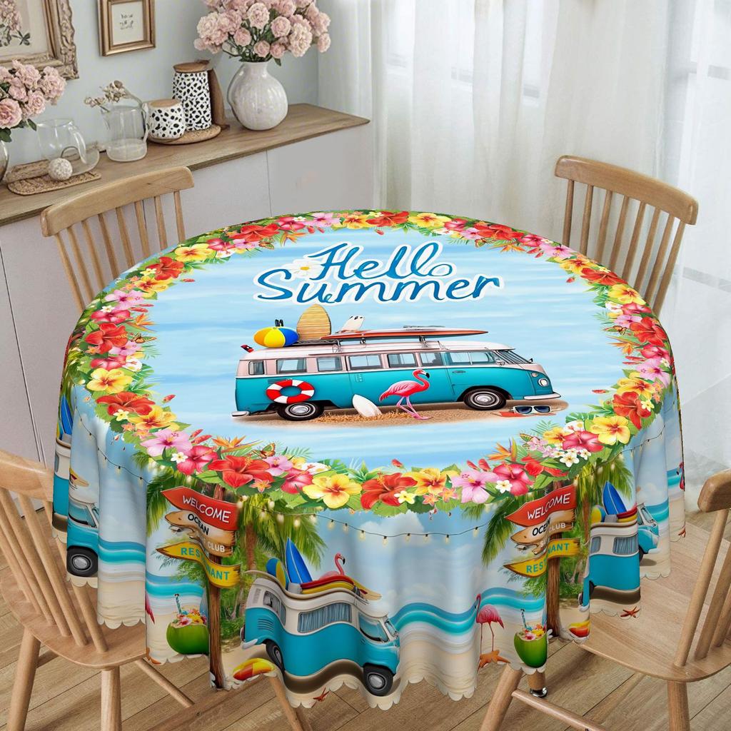 Hello Summer Seaside Round Table Cloth, Bus + Tropical Garland, Beach Resort Table Cloth