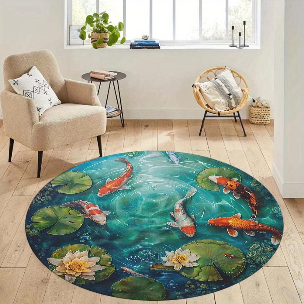 Crystal Velvet Carpet1pc Koi Fish Round Area Mat - 2D Flat Print, Non-Slip Rubber Backing, Hand Wash Only, Vibrant Water Lily Po