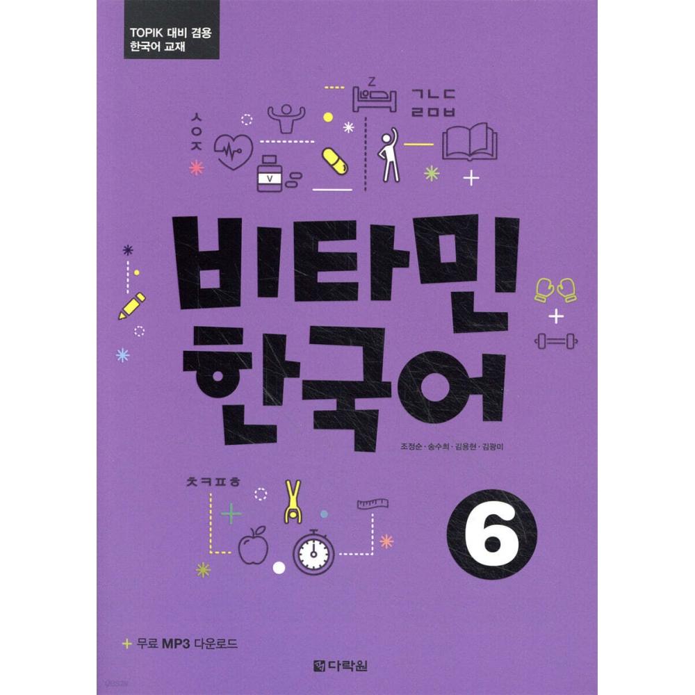 "Vitamin Korean 6" is an integrated textbook designed for advanced learners, providing opportunities for learners from various nationalities to deeply understand Korean language and culture and to communicate effectively. The textbook comprehensively trains the four language skills: speaking, listening, reading, and writing, and is designed to enable easy learning of language functions necessary in various fields. The textbook consists of five chapters covering the themes 'Trends and Culture', 'Arts and Literature', 'Environment and Health', 'Understanding Korea', and 'Tradition and Change', allowing in-depth learning. Also, it includes review exercises that allow practice with TOPIK-type questions, enabling learners to study according to their goals.