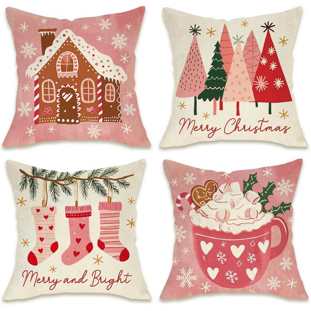 Charming Christmas Pillow Covers: Gingerbread House, Trees, Socks, and Cozy Cup Designs Sofa Room Cushion Cover Home Decoration
