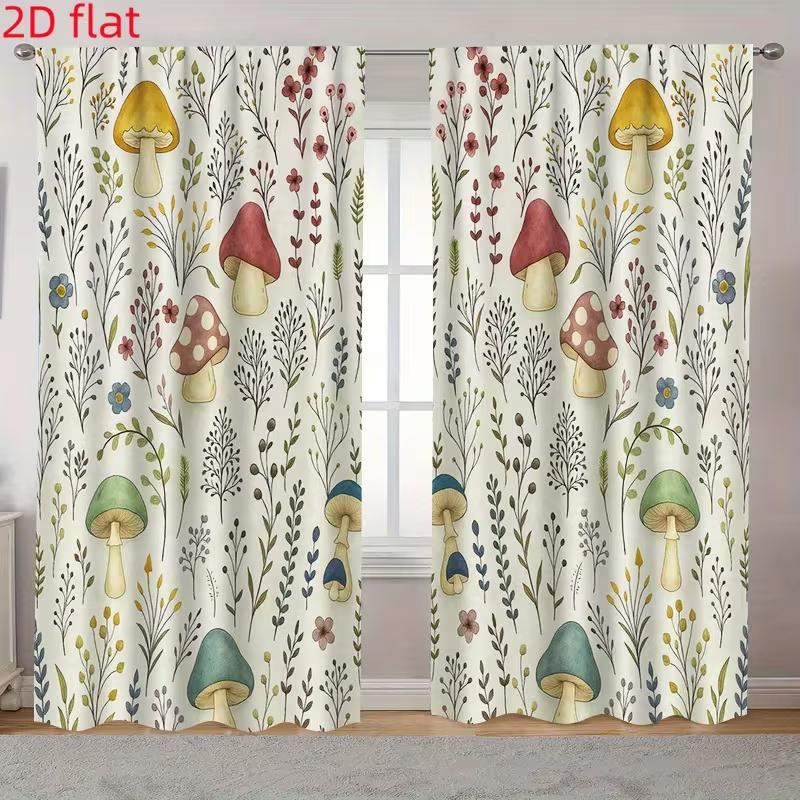 2 Pcs Mushrooms, Grass Print Curtains,suitable for Bedroom,living Room Kitchen Decoration,home Decoration,window Decoration