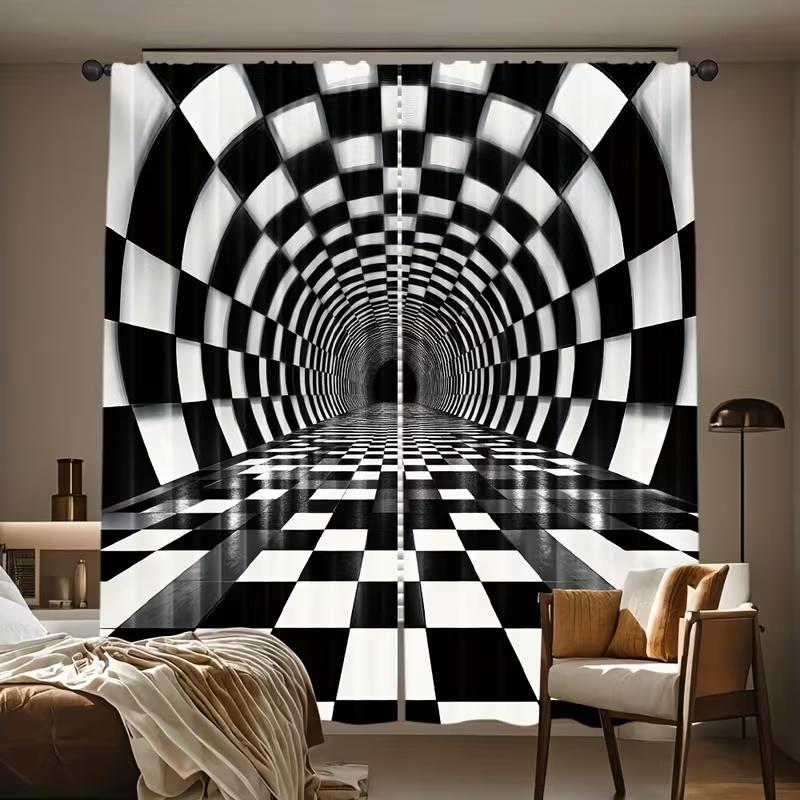2Pcs Black and White Square Print Curtains,suitable for Bedroom,living Room Kitchen Decoration,home Decoration,window Decoration