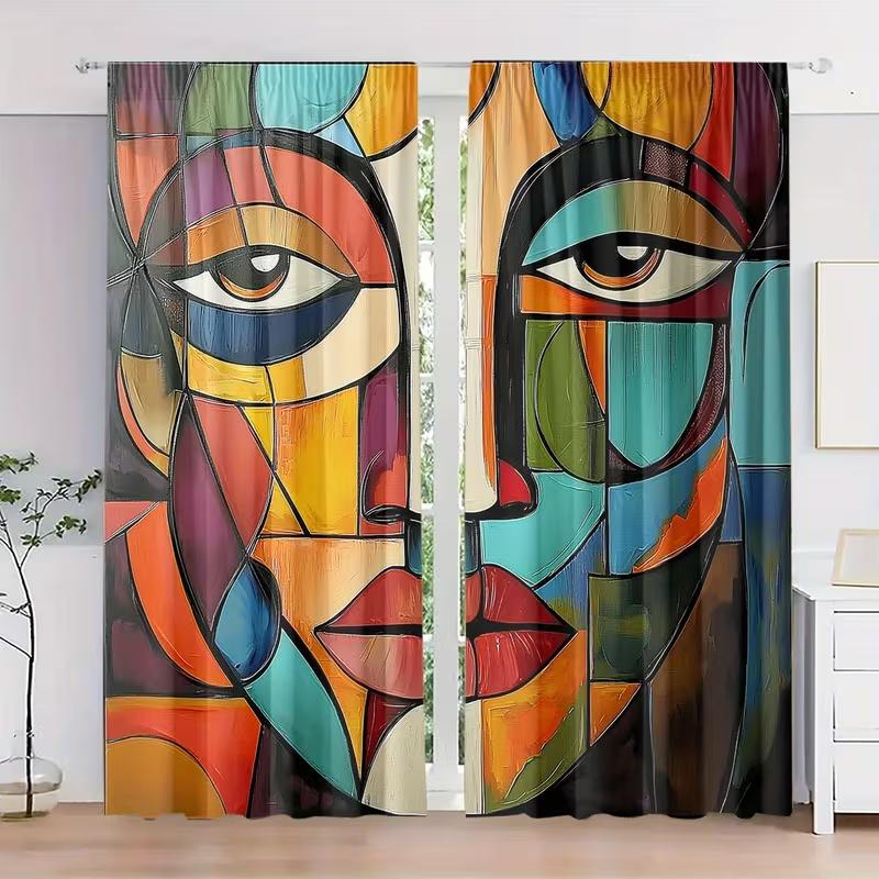 2 Pcs Retro Patchwork Face Print Curtains,suitable for Bedroom,living Room Kitchen Decoration,home Decoration,window Decoration