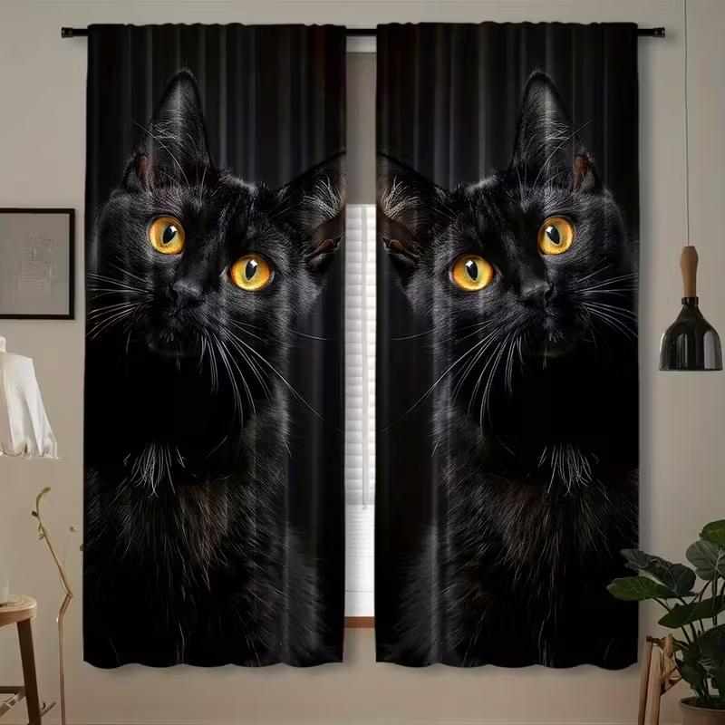 2PCS Black Cat Print Art Curtains, Pole Bag Polyester Material Design, Bedroom, Home Decoration