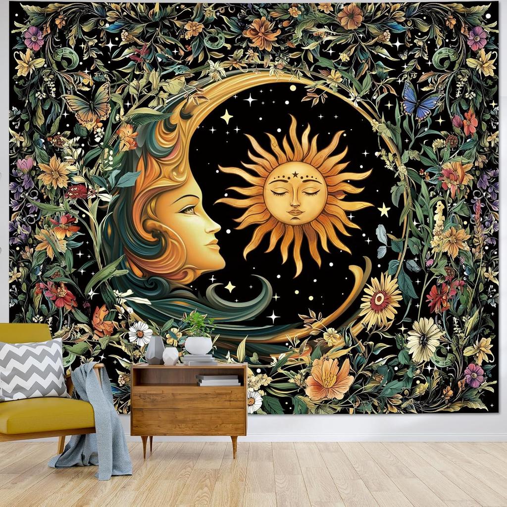 Boho Sun and Moon Tapestry Aesthetic for Bedroom, Bohemian Vintage Mandala Mystic Floral Tapestry Wall Hanging Art Decor