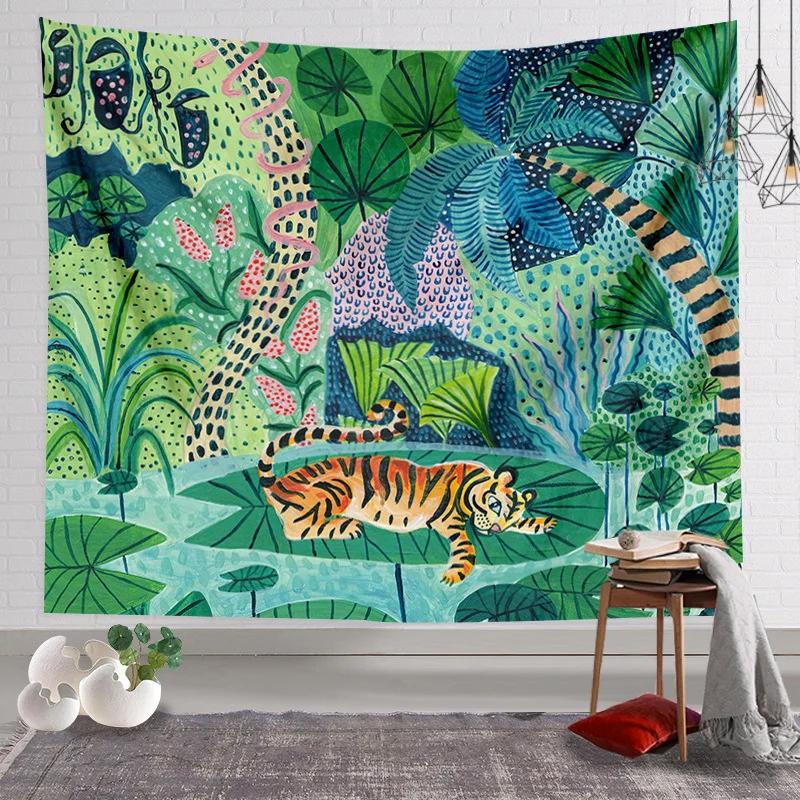 Animal King Forest Tiger Tapestry Wall Hanging Tropical Palm Plant Flower Bohemian Tapestry Home Decoration Yoga Mat Blanket