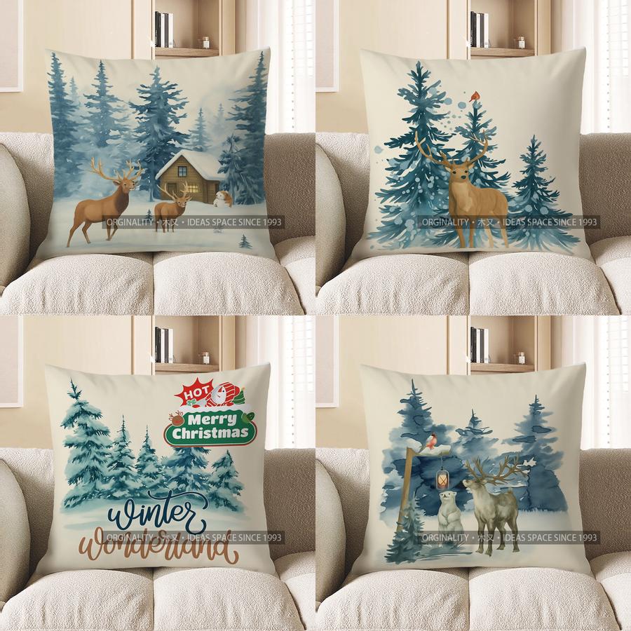 Home Decor Snowy Forest Deer & Cabin Decorative Pillow Pattern Cushion Cover Suitable for Sofa Bedroom Car Pillow Cover