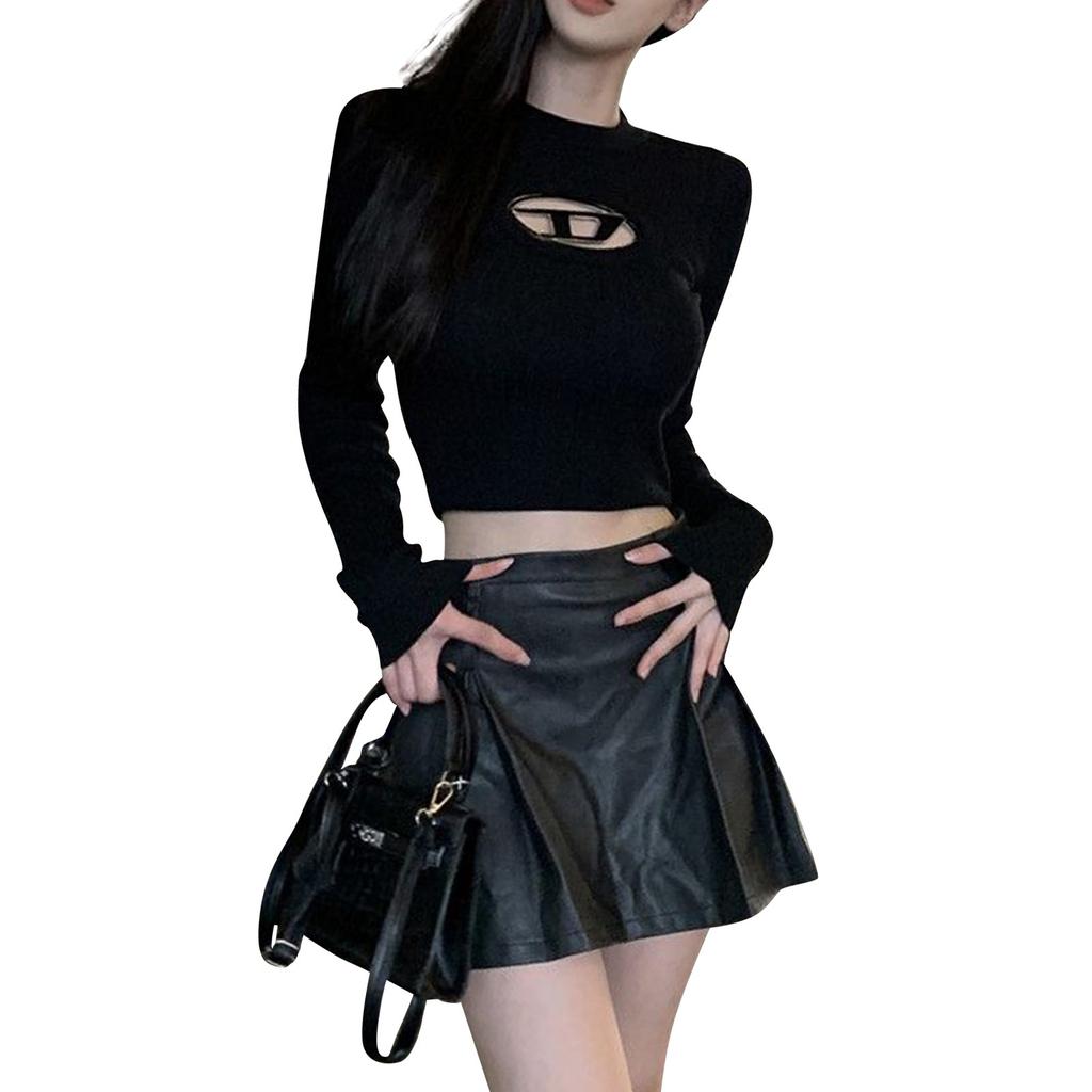 Women's Metal Hollow Out Design Feeling Round Neck Long Sleeved Knitted Shirt Top