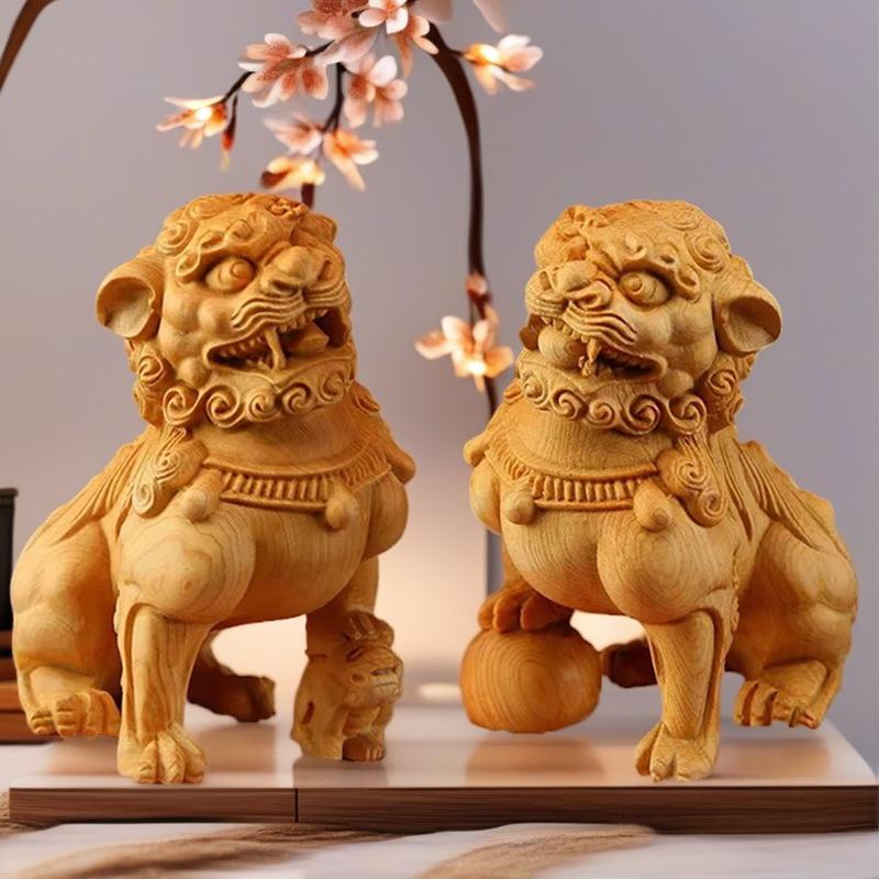 Wood Carving Chinese Forbidden City Lion Statuette , Chinese Characteristics God Beast Animal Home Room Office Feng Shui Statue