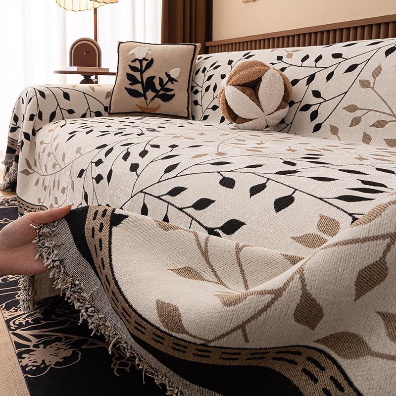 French Leaf Printed Sofa Towel With Tassels Skin-Friendly Chenille Knee Blanket For Office Multifunctional Dustproof Sofa Cover
