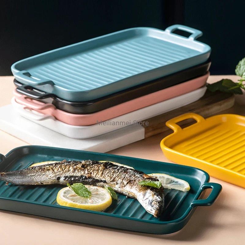 Rectangular Double Ear Oven Grill Plate Large Ceramic Household Fish Plate Grill Plates Household Vegetable Ceramic Plates