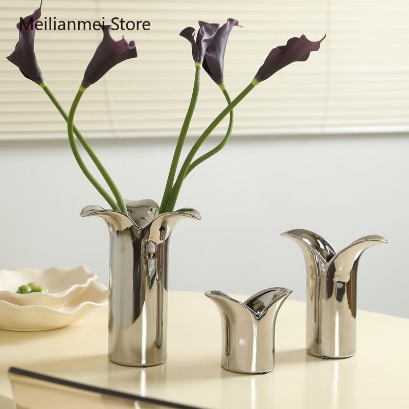 Electroplated Silver Ceramic Vase Irregular Flower Arrangement Ornament Modern High-end Silver Vases Home Decor Vases