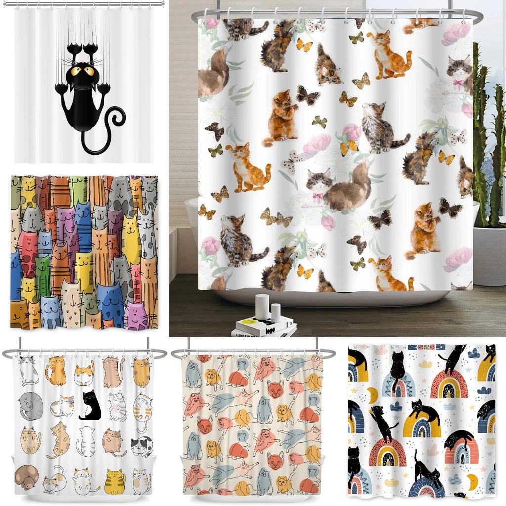 Funny Cat Shower Curtain Cartoon Cute Cats Dog Kids Shower Curtain for Bathroom Waterproof Polyester Home Decor Shower Curtains