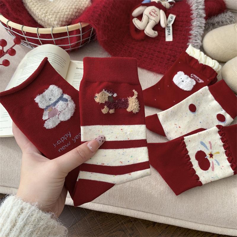 Super Cute Red Socks for Women In Autumn and Winter, Pure Cotton Mid-calf Socks, Cartoon Polka Dot Puppy Dui Dui Socks