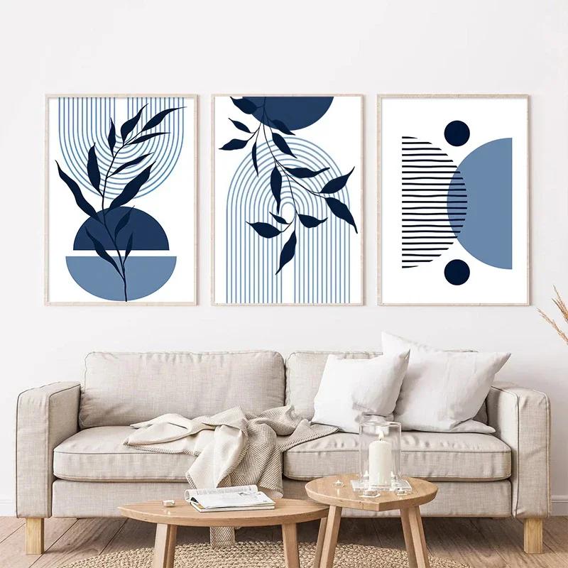 Boho Blue Abstract Modern Wall Art Print Sun Geometric Line Leaf Canvas Painting Nordic Posters Decor Pictures for Living Room
